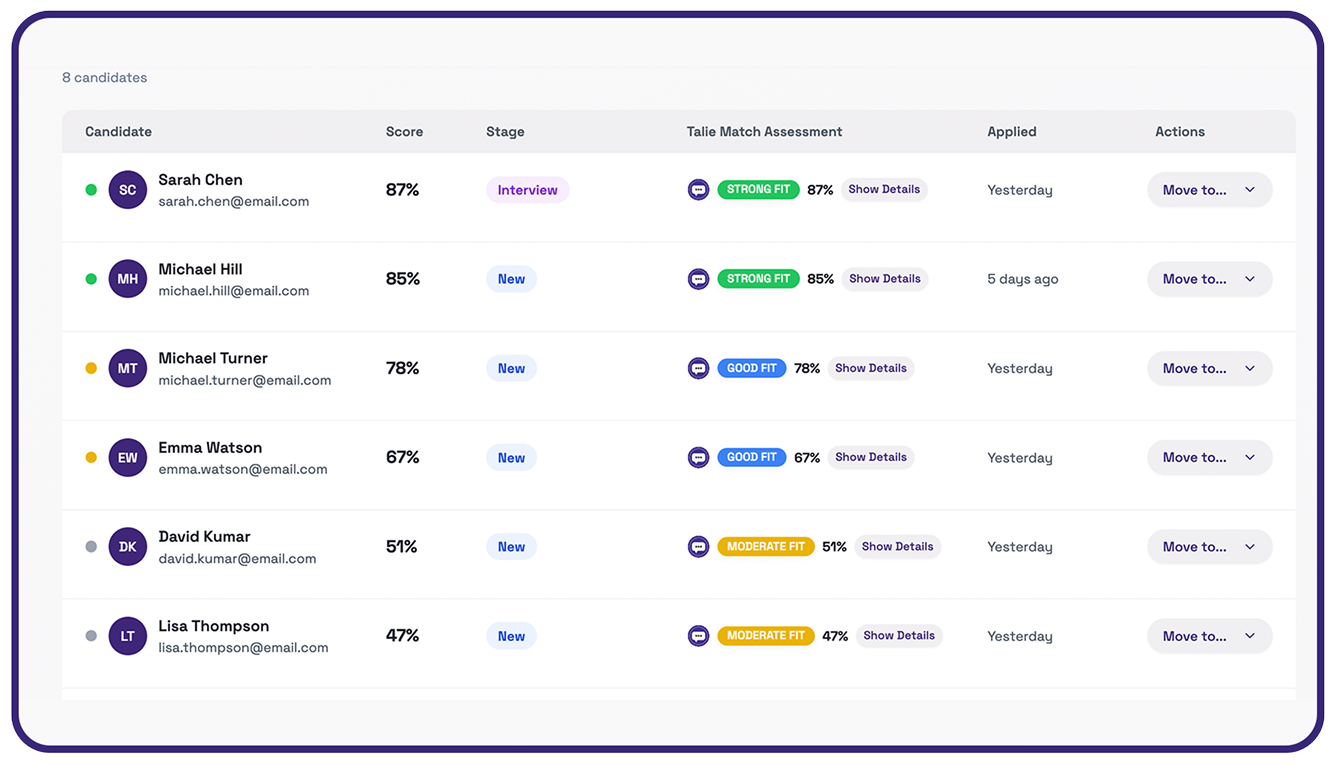So we built Talie™—not a chatbot, but an operating system for hiring.